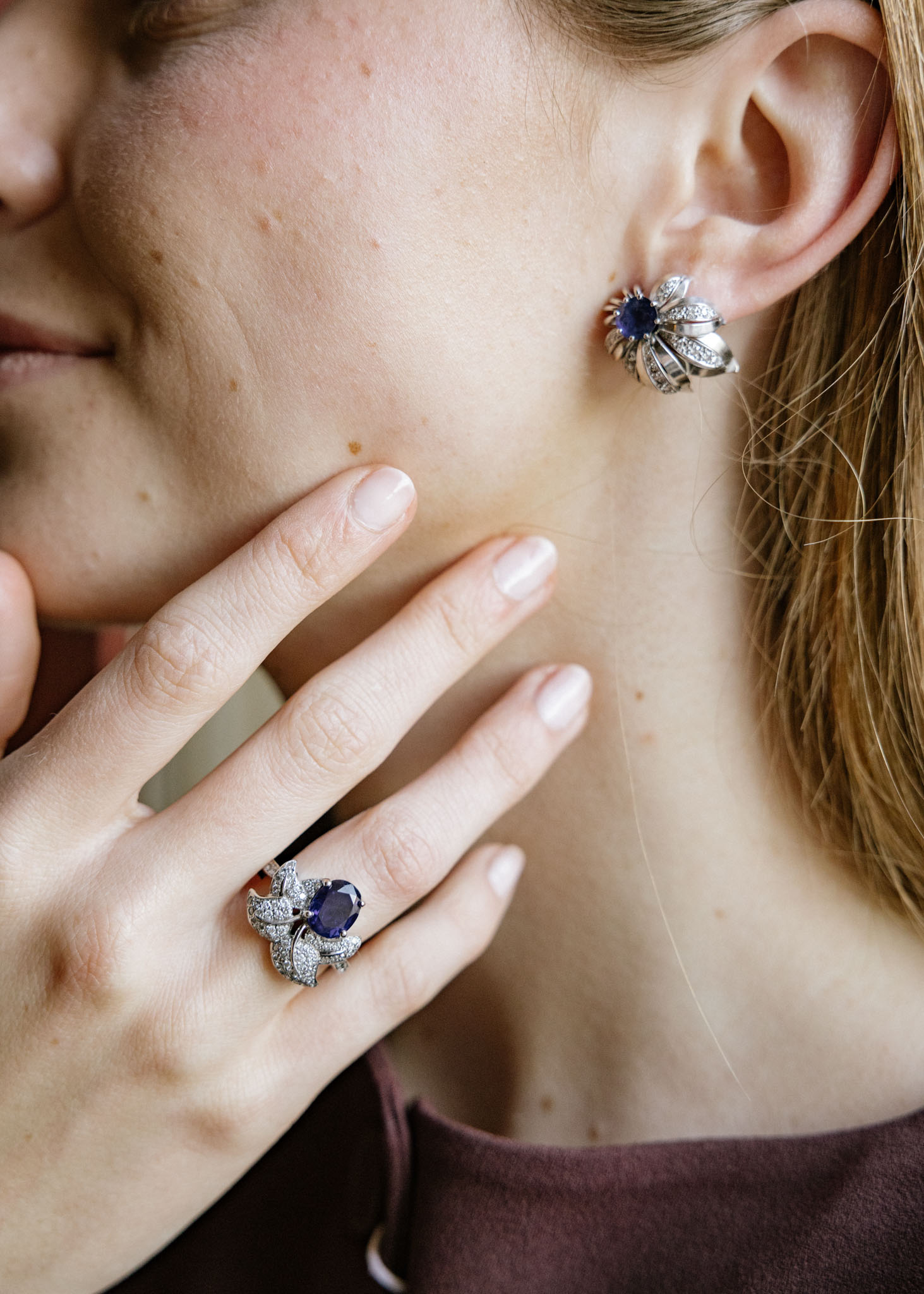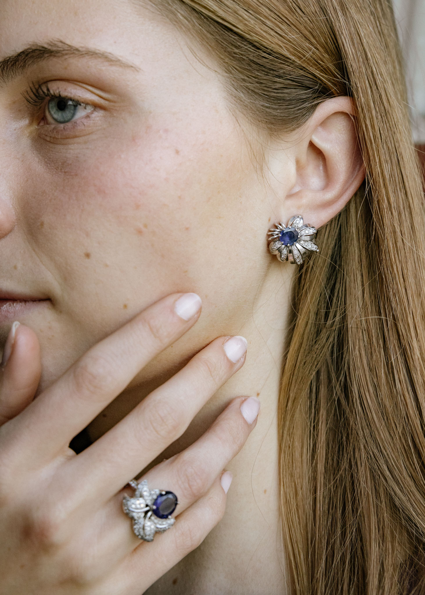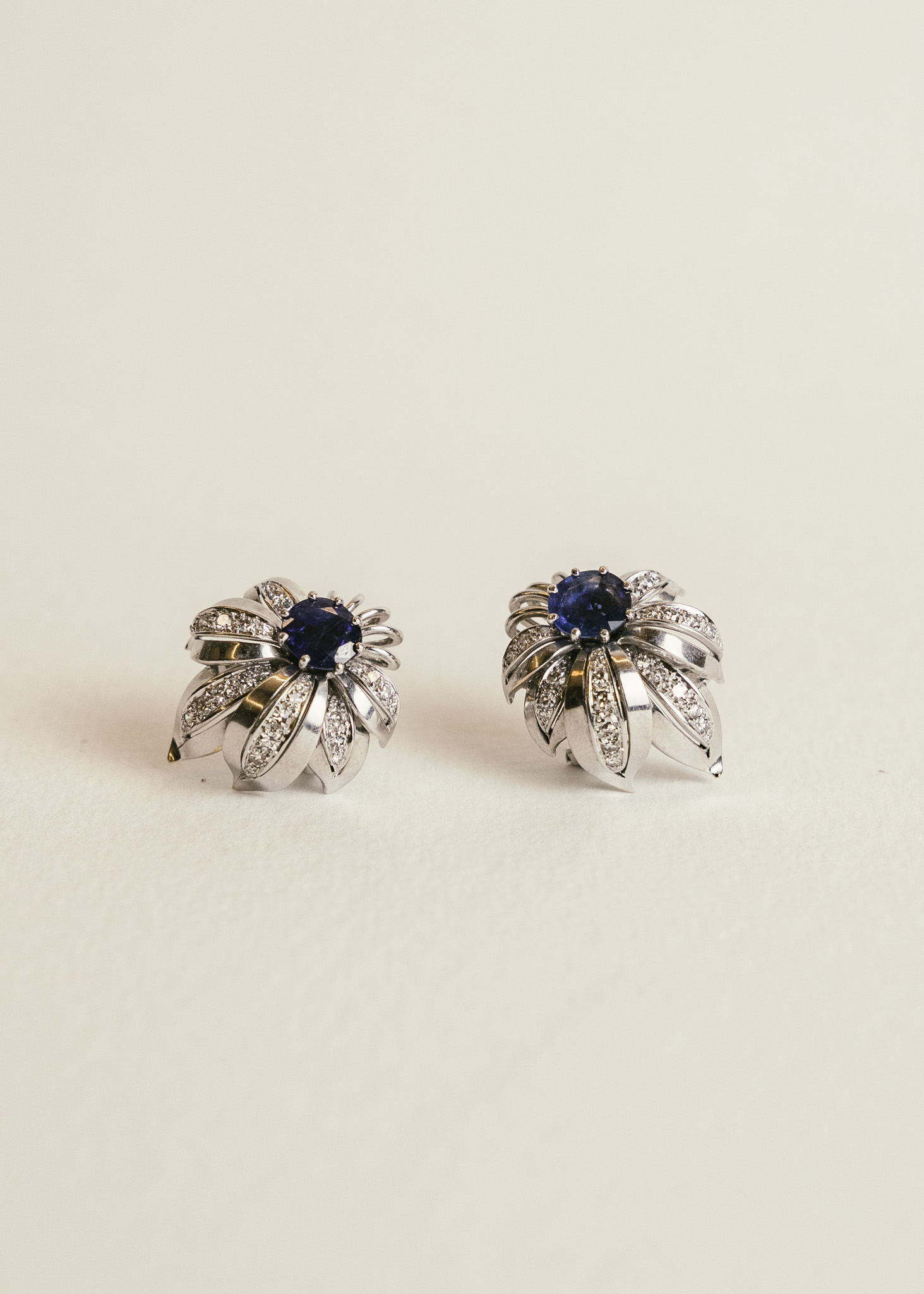 Pendientes años 60 de diseño vegetal realizado en oro blanco 18k, cpompuesto por dos zafiros centrales y rodeado hojas cuajadas por cincuenta y ocho diamantes.