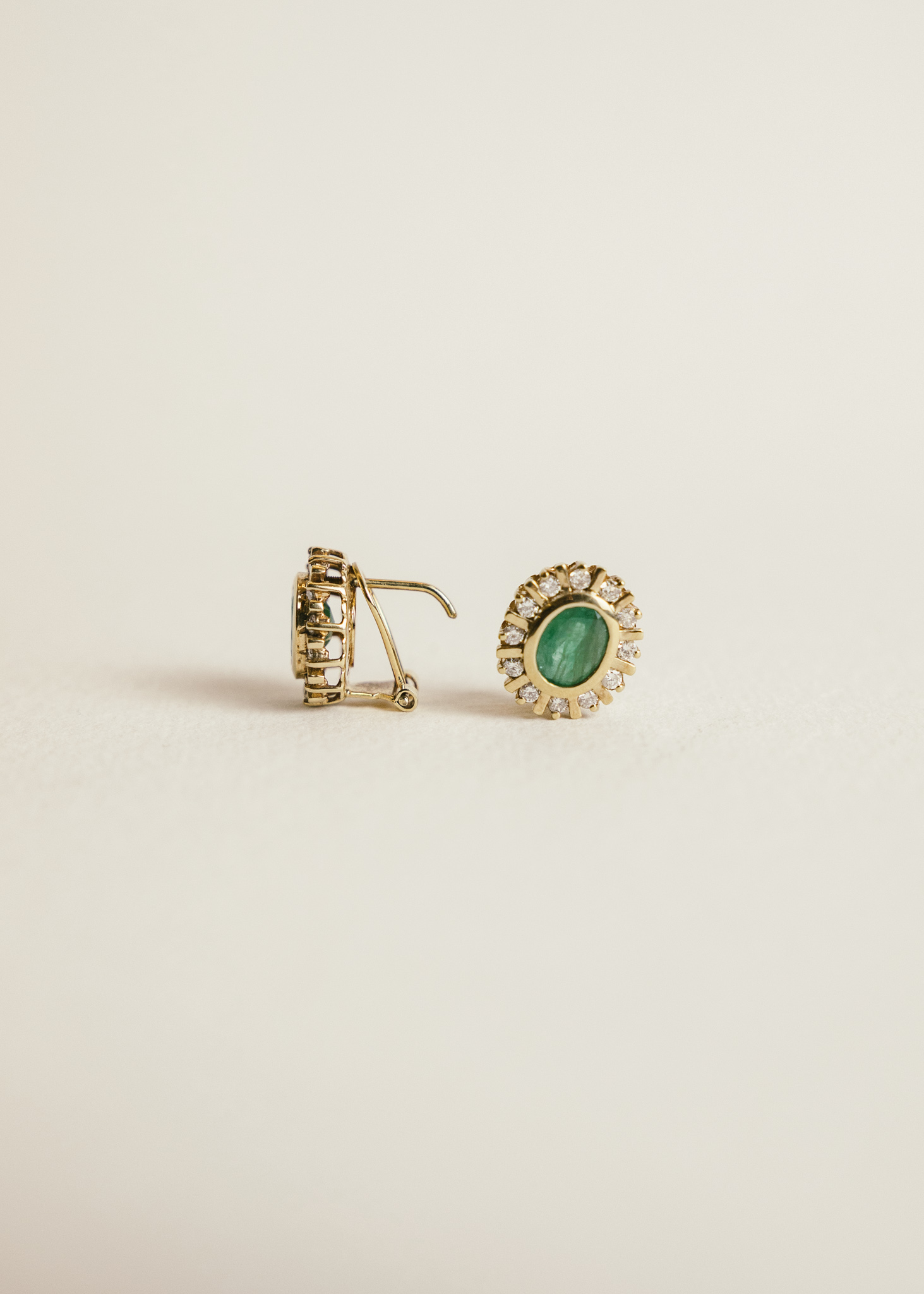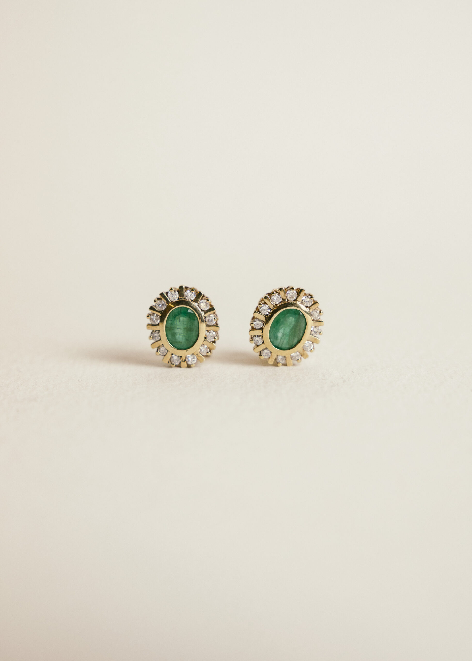 Rosetas de oro 18k con dos esmeraldas centrales montadas en chatón, orladas por veinticuatro diamantes talla brillante.