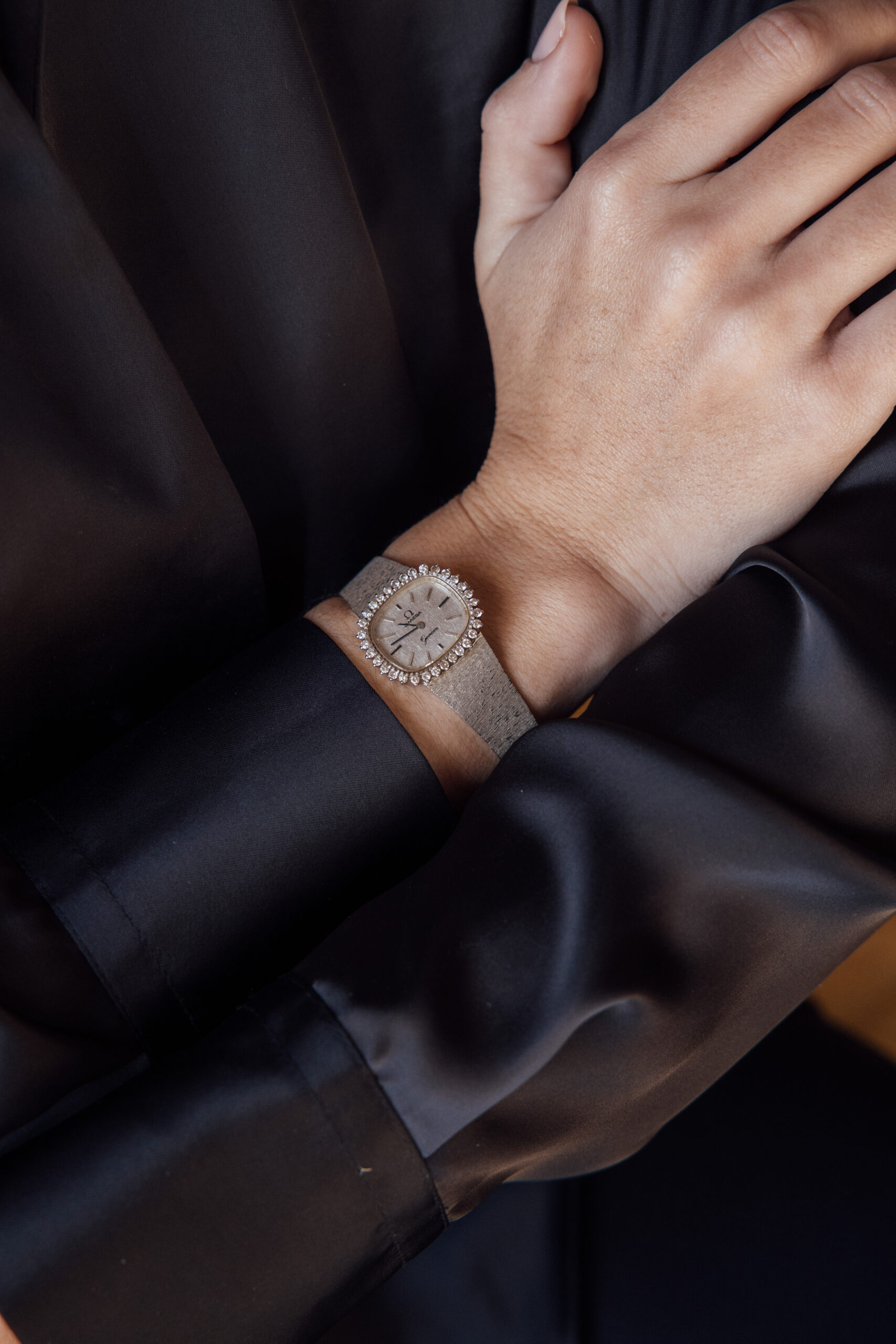 Espectacular reloj joya de Omega Genève de los años 70. Caja en forma Cushion con orla de diamantes.