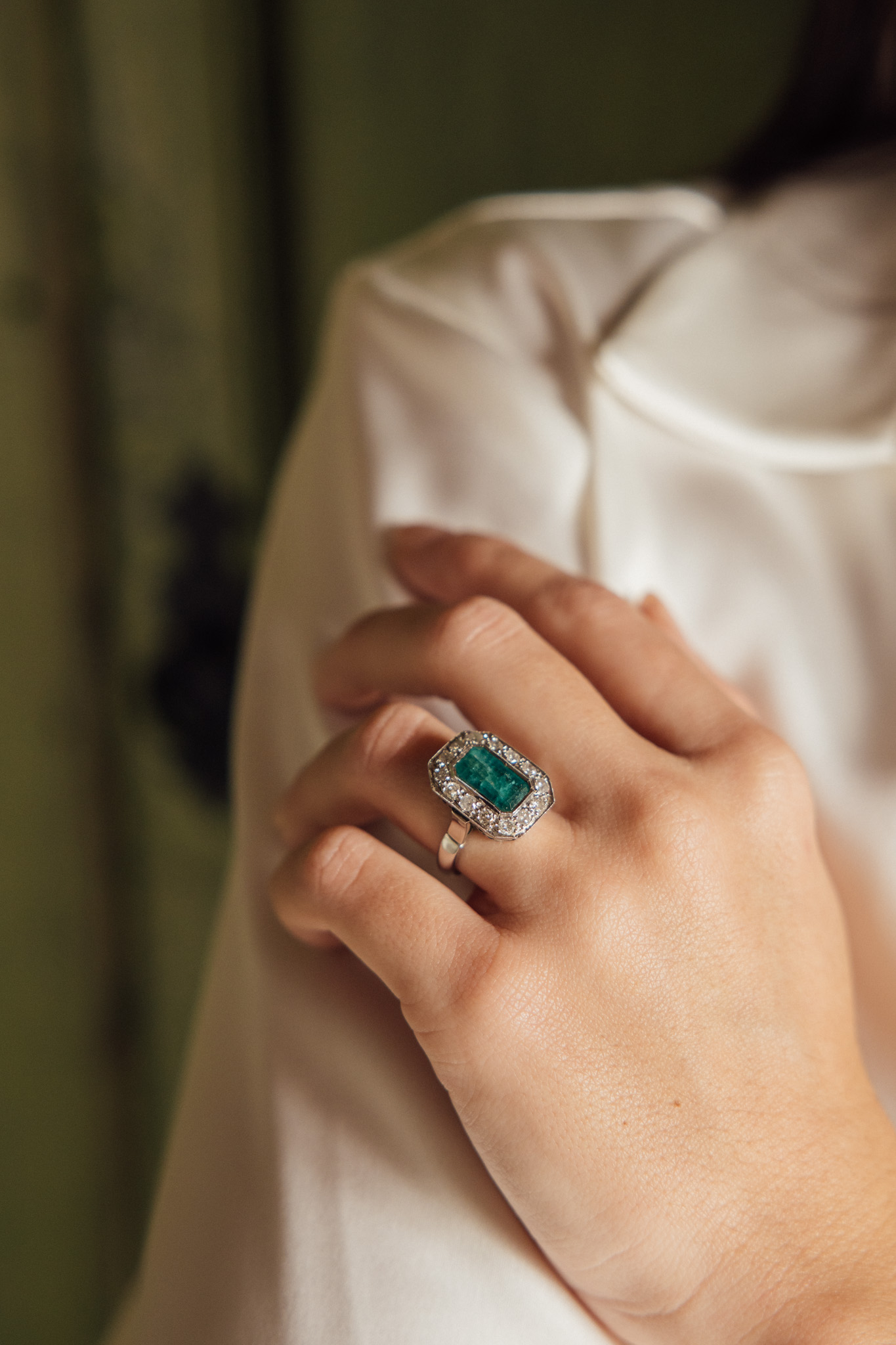 Sortija vintage realizada en paladio con una esmeralda colombiana central de 2,75 quitates, decorada por un halo de catorce diamantes.